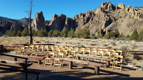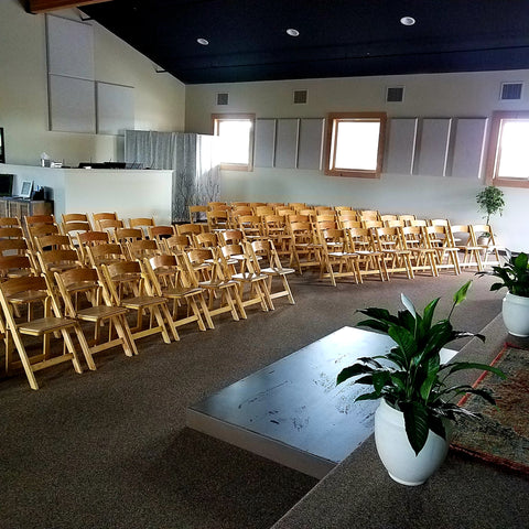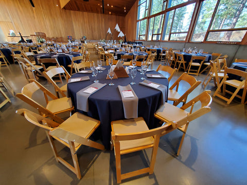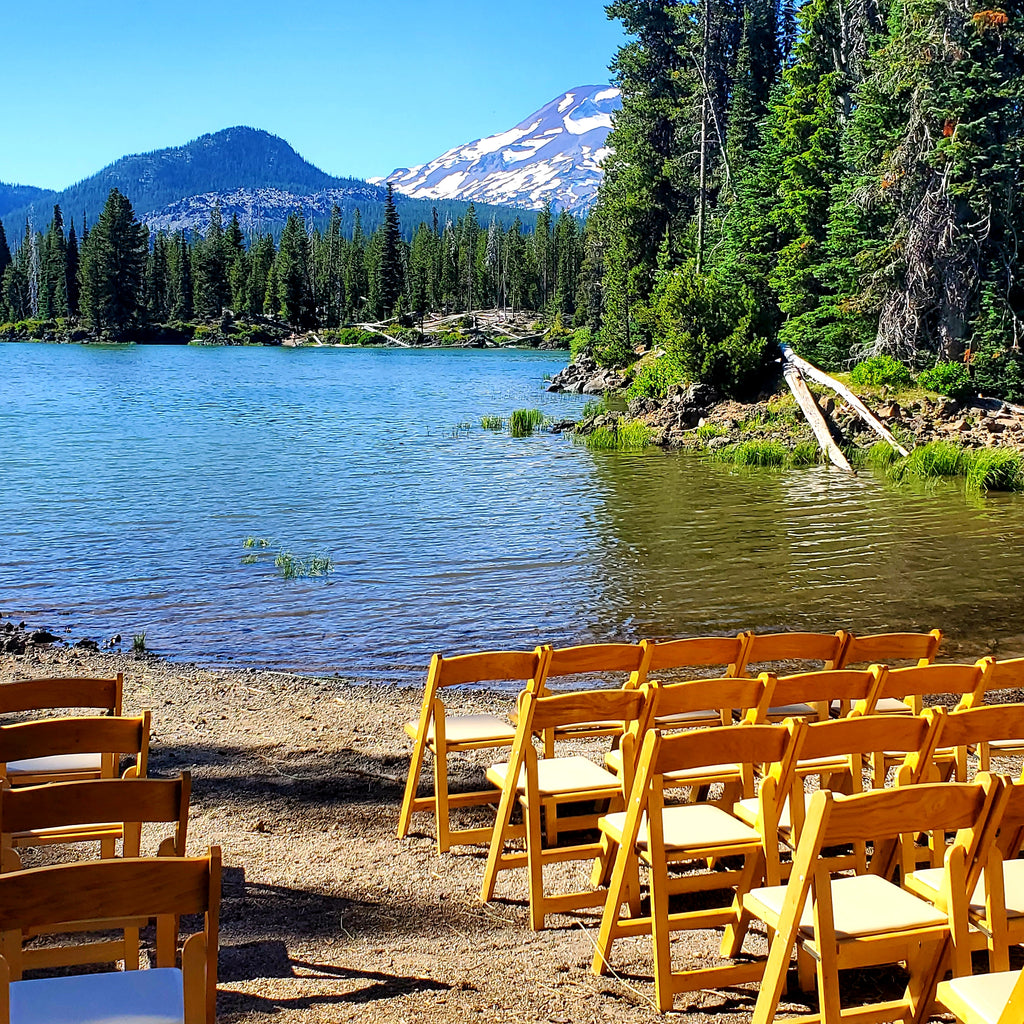 Casual elegance. These beauties are natural wood with slat back and padded seat. Each chairs has it's own unique wood grains.  An incredible seating option. Price reflects rental rate per event.